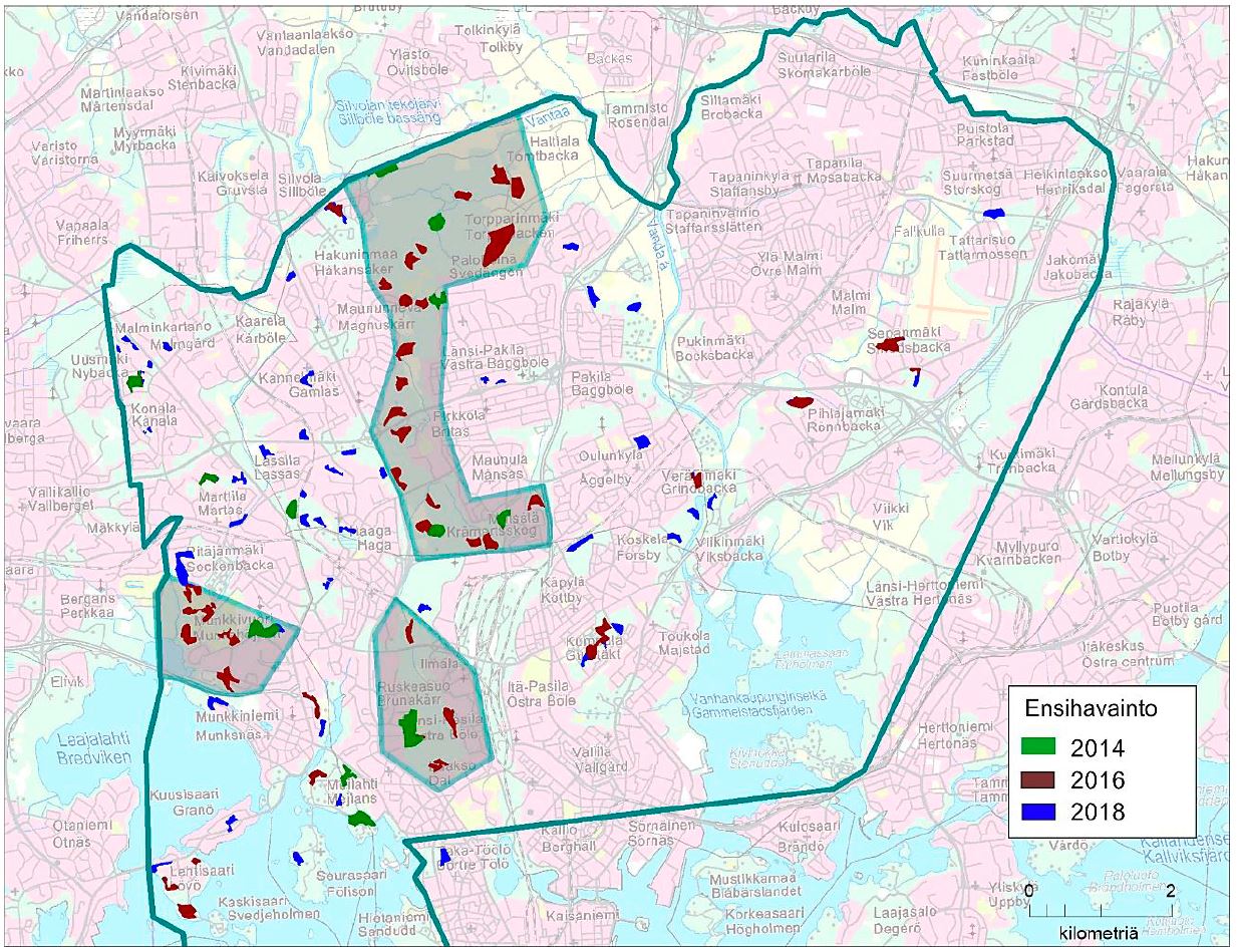 Liito-oravan elinalueiden ensimmäinen havaintovuosi. Varjostettujen alueiden tilannetta ei tarkistettu keväällä 2018. Pohjakartta: Maanmittauslaitos Taustakarttasarja 10/2018, CC 4.0 BY.