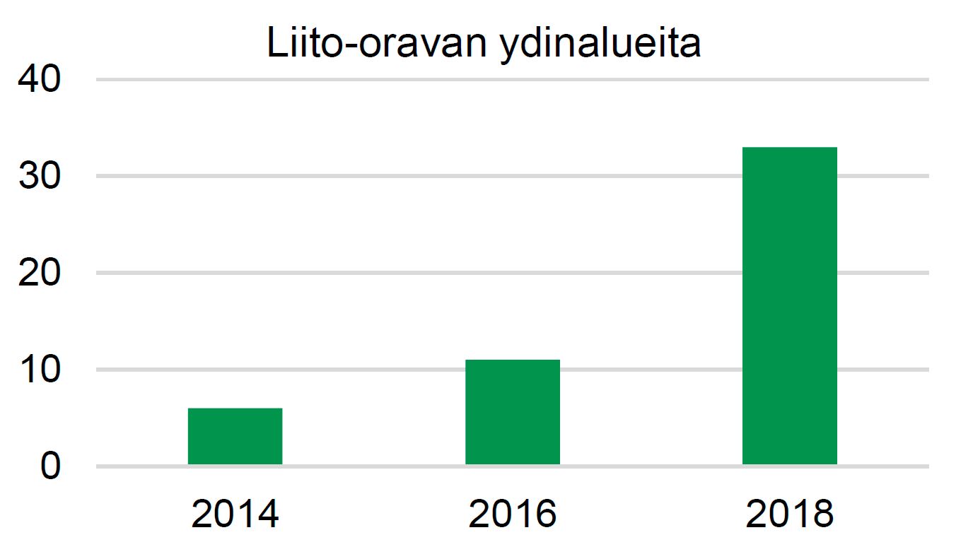 Liito-oravat ovat runsastuneet Helsingissä huimaa vauhtia. Kuvassa on liito-oravan ydinalueiden määrä Keskuspuiston länsipuolelta metsäkohteilta, jotka on tarkistettu kaikkina kolmena vuonna.