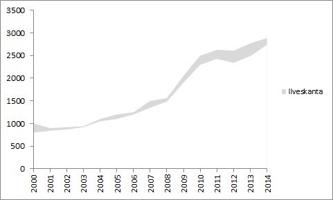 Suomen ilveskannan koko vuodesta 2000 lähtien. Kuvassa harmaana esitetty alue perustuu RKTL:n vuosittain antamiin ilveskanta-arvioihin.