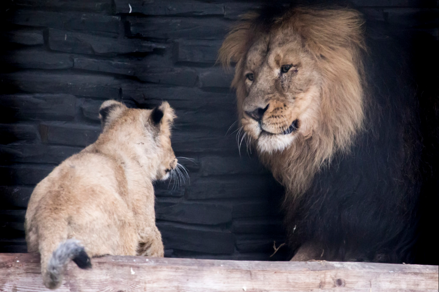 Korkeasaaren urosleijona komentaa pennut syrjään ruokailun ja nokkaunien ajaksi. Kuvaaja: MARI LEHMONEN, KORKEASAAREN ELÄINTARHA