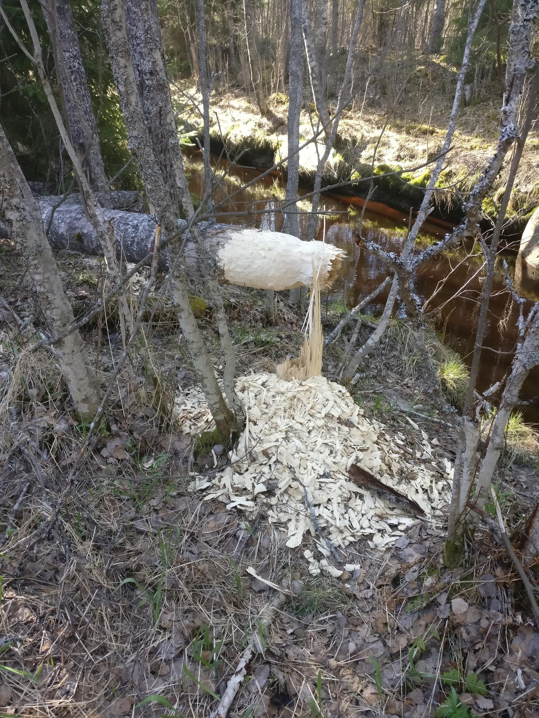 Kuva euroopanmajavan syönnökseltä ja kaatunut haapa Isojoen Siironjoelta. Kuvaaja: Nico Karlström.