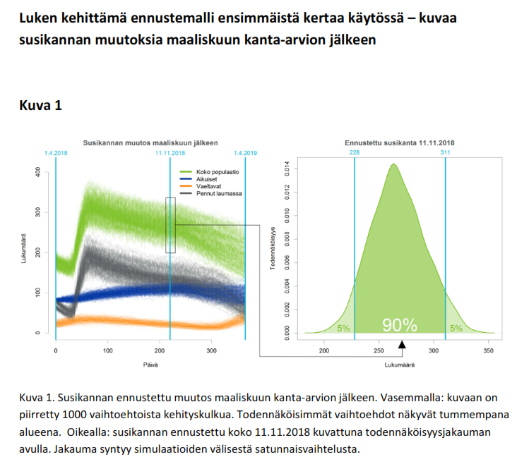 Kun syksyn 2018 ennustetta verrataan mallin tuottamaan takautuvaan ennusteeseen syksylle 2017 (213–273), arvioiden suuruudessa ei kuitenkaan ole merkittävää eroa. Kanta kääntyy tyypillisesti talven tullessa jyrkempään laskuun, koska sekä ihmisen aiheuttama että luonnollinen kuolevuus ovat lumipeitteisissä maissa silloin suurempia kuin sulan maan aikana.