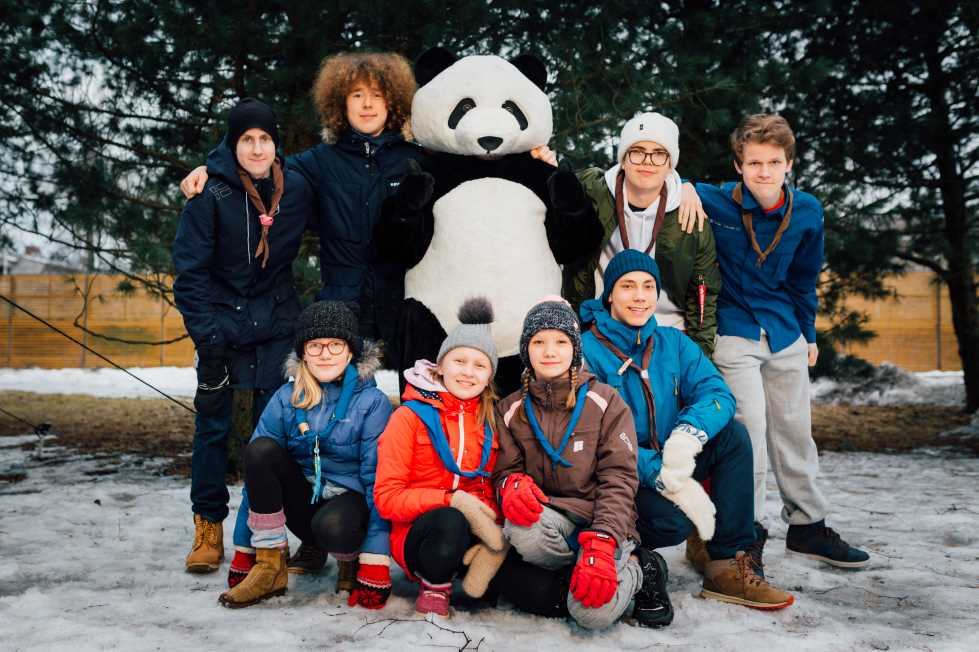 Kuvaaja: Susanna Mikander. Kuvassa Haagan Eräveikkojen ja Suosirrien partiolaisia sekä WWF:n tunnuseläin panda.
