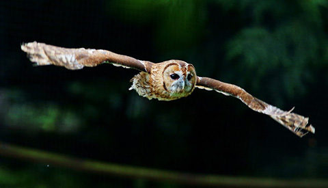 Lehtopöllöuros saalistaa suurimman osan ravinnosta ja naaras puolestaan hautoo munia ja suojelee pesää. Kuva: Peter Trimming