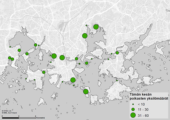 Tämän kesän poikasten jakaantuminen Espoossa ja Helsingissä 29.7.2014.