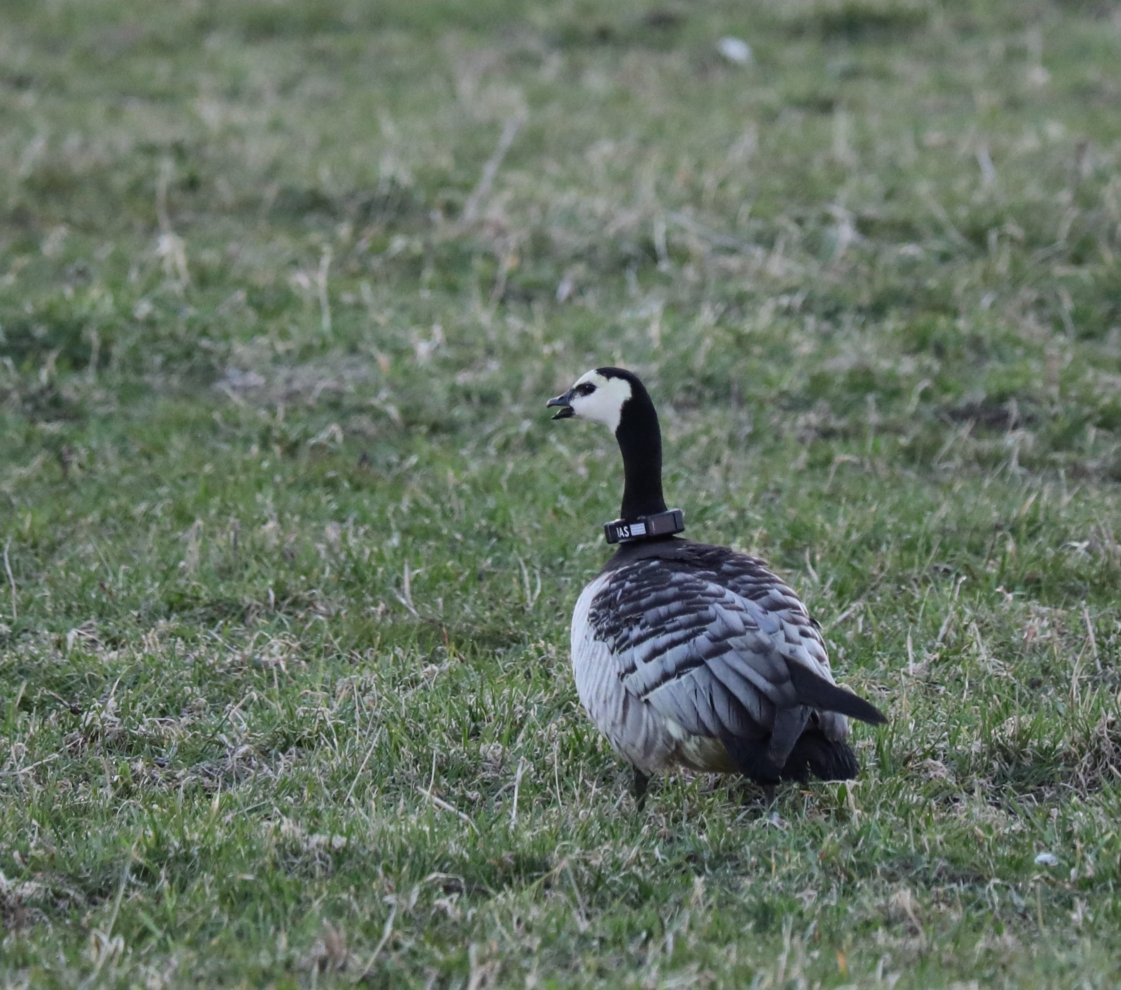 GPS-lähettimellä varustettu valkoposkihanhi valmiina paljastamaan hanhien liikkeitä Keski-Karjalassa. Kuva Jukka Forsman/Luke.