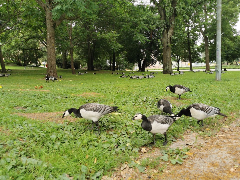 Valkoposkihanhia Kaisaniemen puistossa Helsingissä. Kuva: Aleksi Mikola, Suomen ympäristökeskus