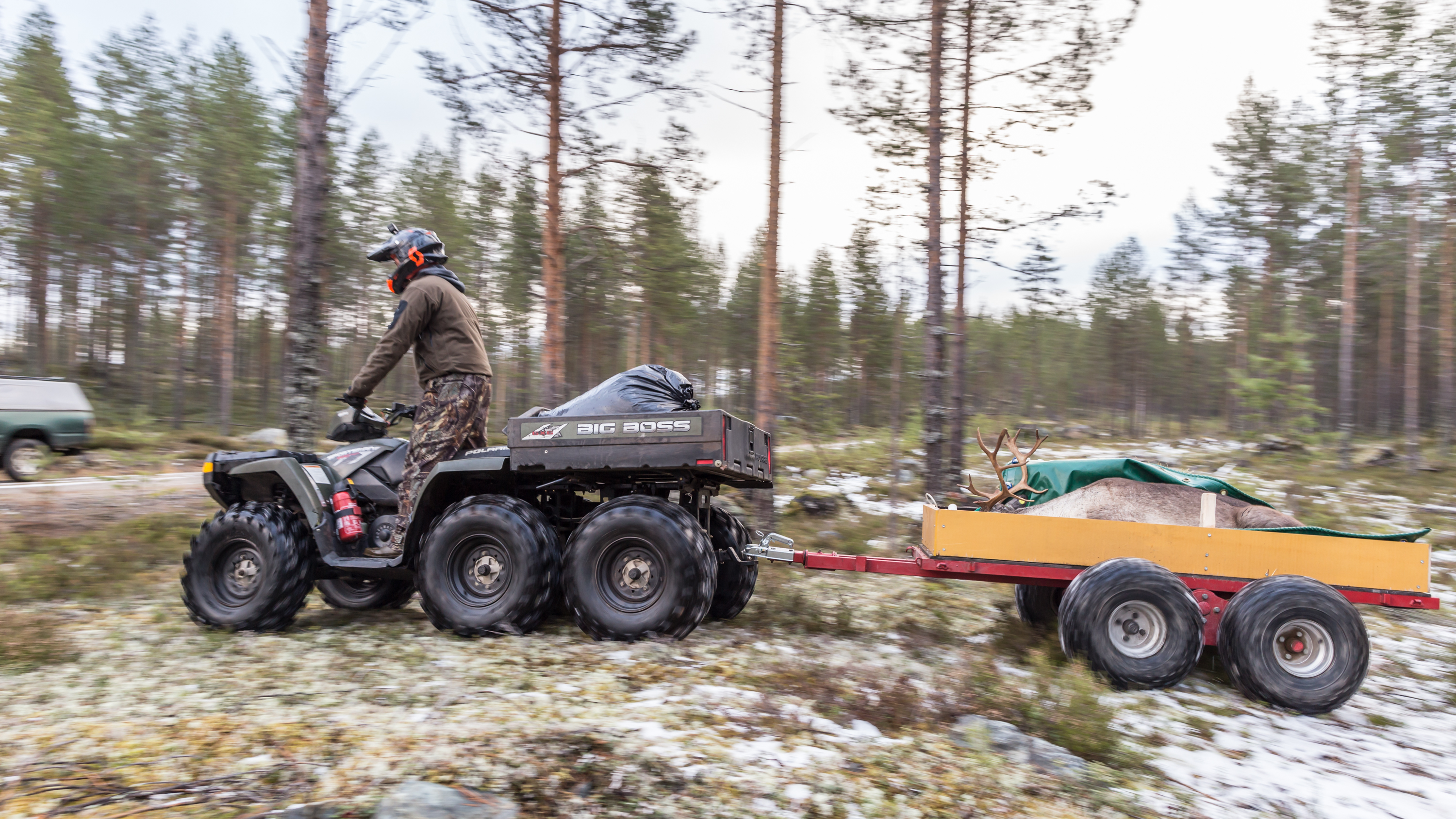 Kuhmossa nukutettu metsäpeura saa mönkijäkyydin kuljetusautoon. Metsäpeurat nukutettiin eläinlääkärin valvonnassa ja kuljetettiin totutustarhoille villieläinten kuljetuksiin tarkoitetulla kalustolla. kuvaaja Tiina Mäkelä